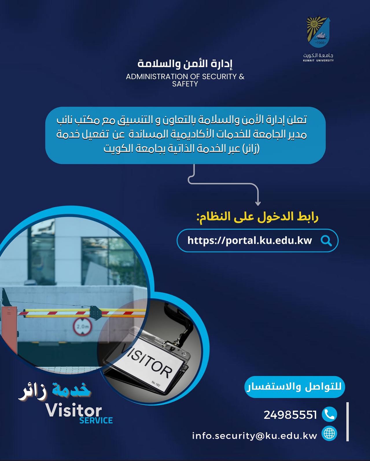 تعلن إدارة الأمن والسلامة بالتعاون والتنسيق مع مكتب نائب مدير الجامعة للخدمات الأكاديمية المساندة عن تفعيل خدمة (زائر) عبر نظام الخدمة الذاتية بجامعة الكويت، والتي تتيح حجز موعد مسبق لدخول الزائرين من خارج الجامعة.