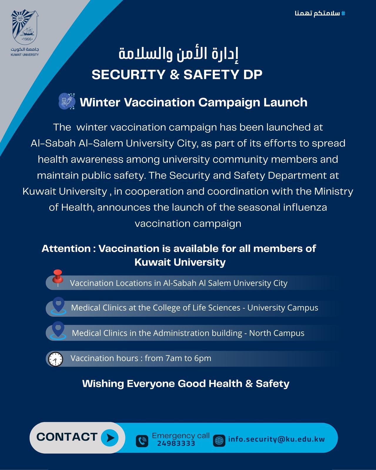 The launch of the Winter Vaccination Campaign at Sabah Al-Salem University City comes as part of contributing to raising health awareness among members of the university community and maintaining public safety. The Security and Safety Department at Kuwait University, in cooperation and coordination with the Ministry of Health, announces the launch of the vaccination campaign against seasonal influenza.