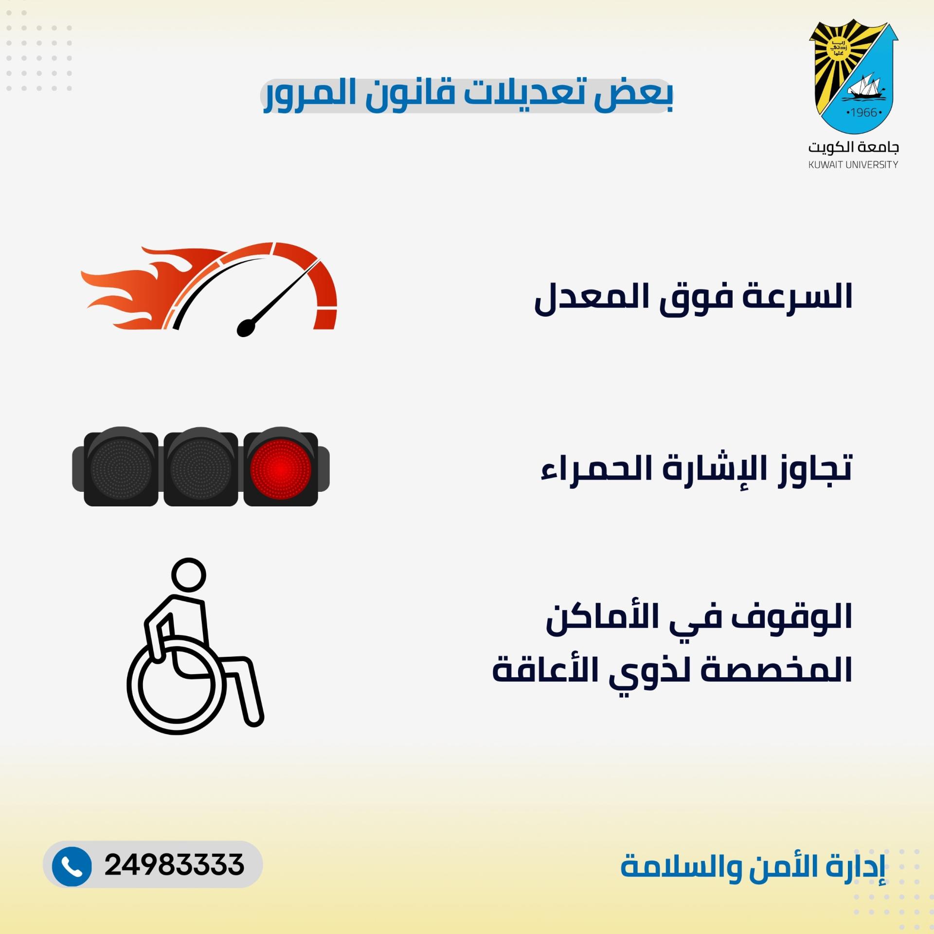 Kuwait University, represented by the Security and Safety Department, would like to emphasize the importance of adhering to the instructions outlined in the Secretary General’s Circular No. (29), issued on 2025/04/06, regarding the new traffic law amendments that will come into effect starting from 2025/04/22.