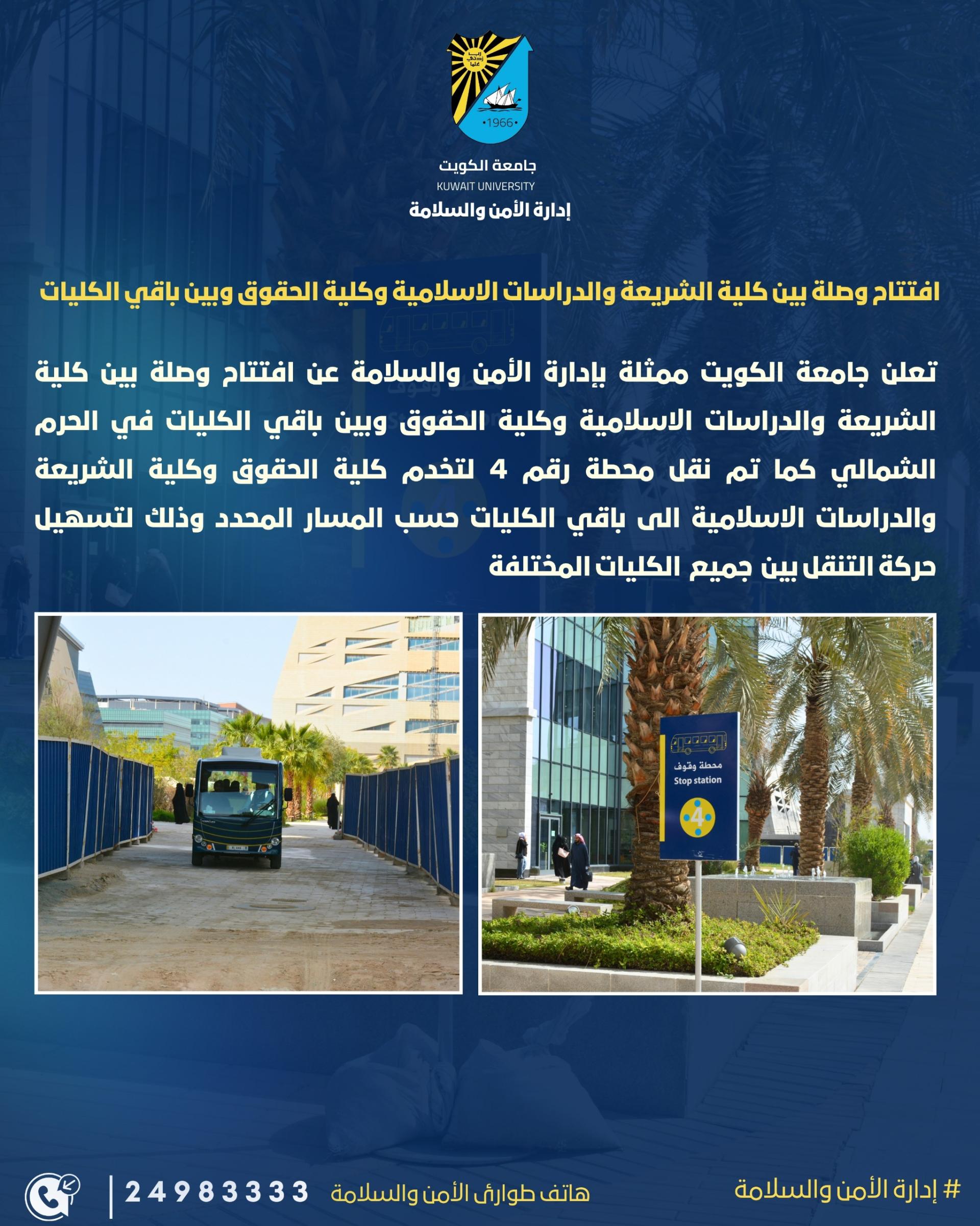 Kuwait University, represented by the Security and Safety Department, announces the inauguration of a transport link connecting the College of Sharia and Islamic Studies and the College of Law with all other colleges in the North Campus.