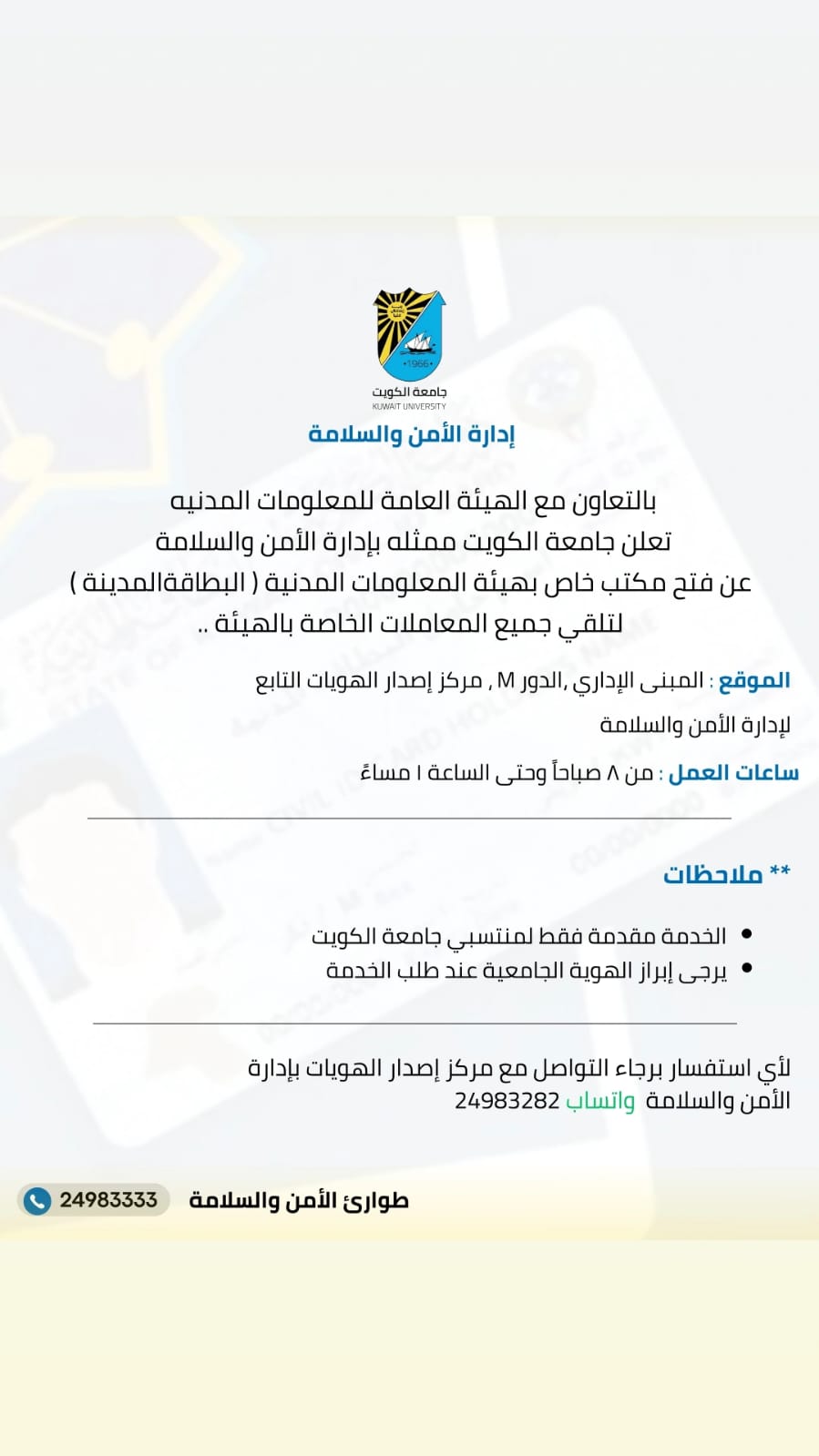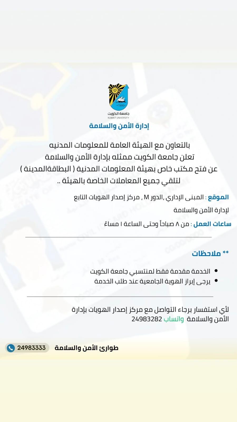 In cooperation with the Public Authority for Civil Information, Kuwait University, represented by the Security and Safety Administration, announces the opening of a special office for the Civil Information Authority (Civil ID) to receive all transactions related to the authority.
