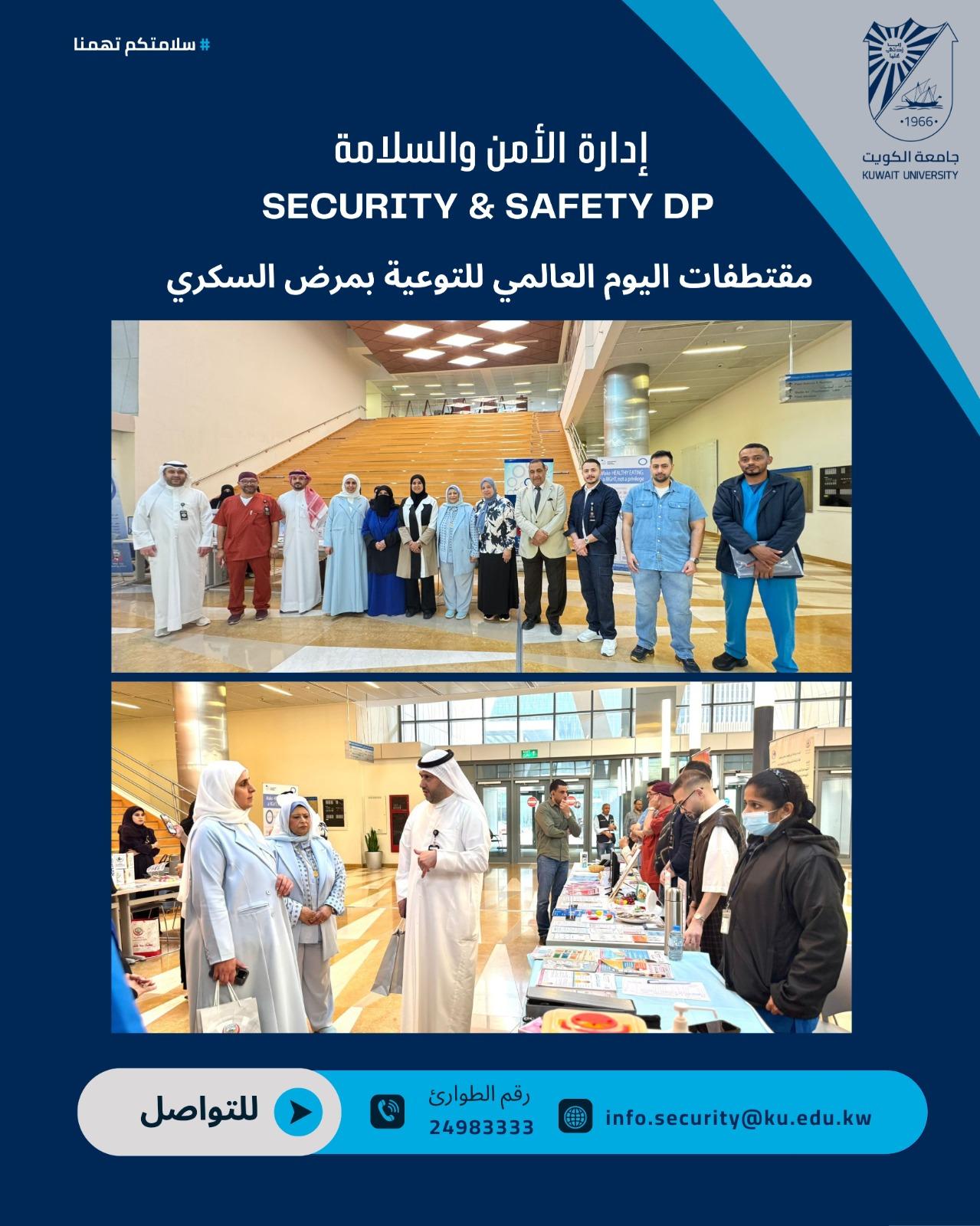 Kuwait University, represented by the Security and Safety Department, in coordination and cooperation with the Ministry of Health, represented by the Health Promotion Department, organized an awareness exhibition titled “World Diabetes Day,” in conjunction with the global campaign to raise awareness about diabetes. The event was held on Thursday, 13/11/2025, at the College of Life Sciences (Southern Campus) in Sabah Al-Salem University City, with the aim of raising awareness about diabetes to improve prevention, diagnosis, and therapeutic management of the condition, and to enhance the awareness and educational level of members and visitors of the university campus and all segments of society to prevent diabetes, and to raise awareness on how to follow a healthy lifestyle, the dangers of diabetes, and the methods and means of preventing it, focusing on avoiding the disease rather than focusing on treating or dealing with it.